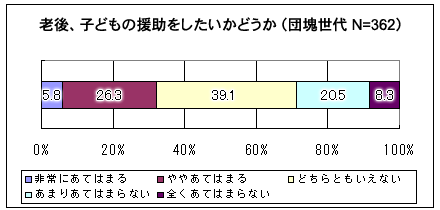 老後の生活で、できる限り自分の子供の援助をしたいかについては、「どちらともいえない」が39.1%と最も多い。また3割は「子どもの援助はしたくない」と態度を明らかにもしている。また、子どもに遺産を残すかどうかについても、「どちらともいえない」が43.9%と最も多い。子ども世帯とはあくまでも独立した世帯として、生活をおくっていきたいというのが団塊世代なのだろう。