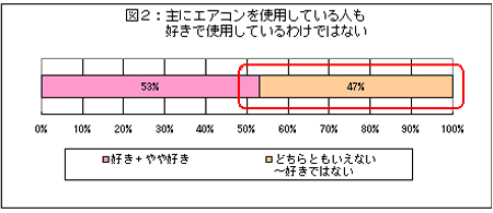 涼み方は人それぞれであるが、実際にエアコンを使用している人は多い。生活者はエアコンをどのように評価しているのだろうか。都市生活研究所が2008年8月に実施した調査(既婚女性46名対象)によると、リビングでは主にエアコンを使用している人が多い(図1参照)が、エアコンが好きかどうかを確認すると、「どちらともいえない」~「好きではない」は約半数にのぼり(図2参照)、必ずしも好きで使用しているわけではないと考えられる。その理由は、約9割が「健康に悪い(体がだるくなる、喉が痛くなるなど)」と回答しており、特に健康面が気になっていることがわかる(図3参照)。